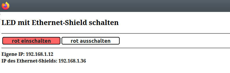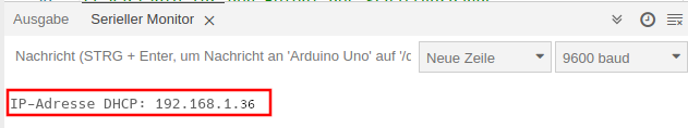 Im Seriellen Mon­i­tor wird die IP des Eth­er­net-Shields angezeigt. Diese Adresse wird in einem Brows­er eingegeben.