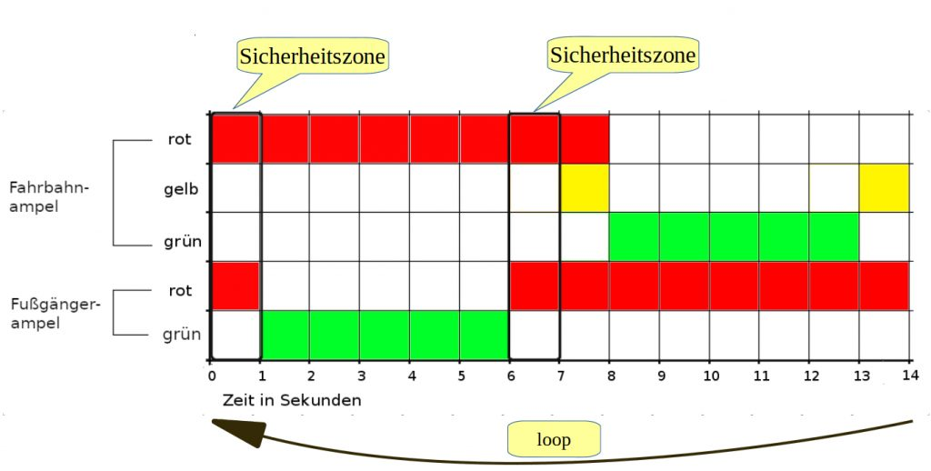 Eine Ampel soll zusammen mit einer Fußgängerampel in einem festgelegten Takt geschaltet werden.