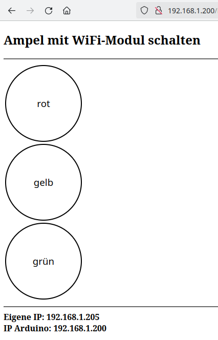 1 2 3 4 5 6 7 8 9 10 11 12 13 14 15 16 17 18 19 20 21 22 23 24 25 26 | #include “WiFiS3.h” // Router-SSID/Passwort anpassen char Router[] = “Router_SSID”; char Passwort[] = “xxxxxxx”; // Pins der LEDs int ROT = 5; int GELB = 6; int GRUEN = 7; // Schalter für den Zustand der LEDs (false->aus, true-> an bool RotAn = false; bool GelbAn = false; bool GruenAn = false; // statischeIP = false -> IP-Adresse über DHCP vergeben // statischeIP = true -> statische IP festlegen bool statischeIP = true; // statische IP anpassen IPAddress ip(192, 168, 1, 200); WiFiServer WiFiServer(80); WiFiClient WebClient = WiFiServer.available(); |