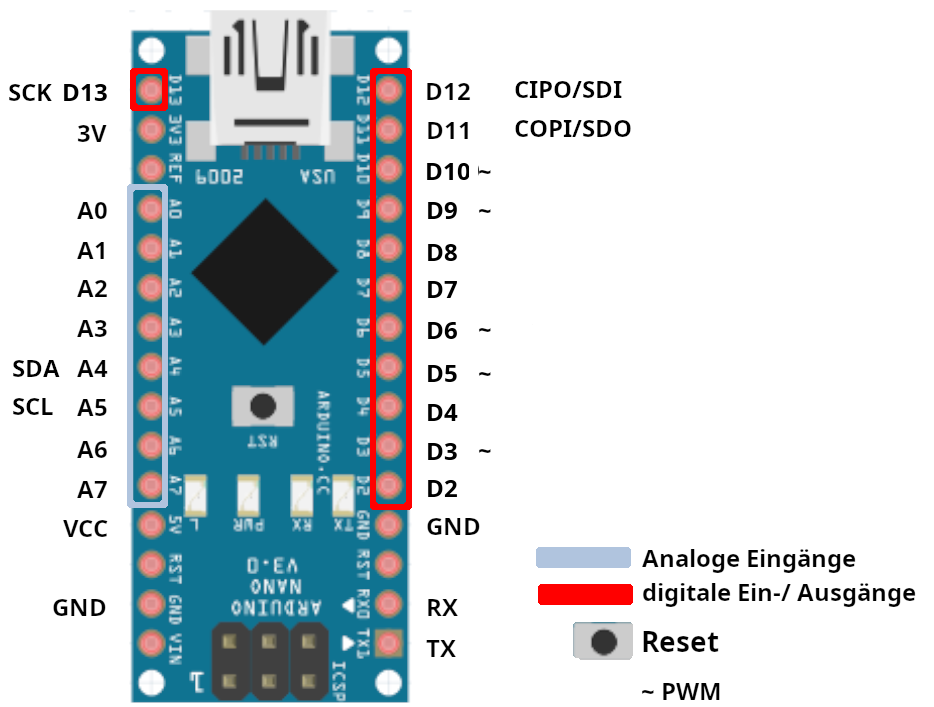 - Die digitalen Ein-/Ausgänge liefern im Normalfall ein HIGH (1) oder LOW (0). Eine Ausnahme bilden die mit einem ~ gekennzeichneten Pins. Sie können mit der ⇒Pulsweitenmodulation angesprochen werden.