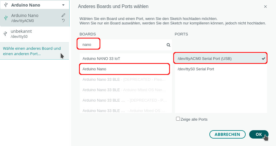 Wenn der Arduino Nano nicht automatisch erkannt wurde, klicke auf “Wähle ein anderes Board und einen anderen Port” und suche nach nano. Je nach Betriebssystem wird der USB-Port eine andere Bezeichnung haben.