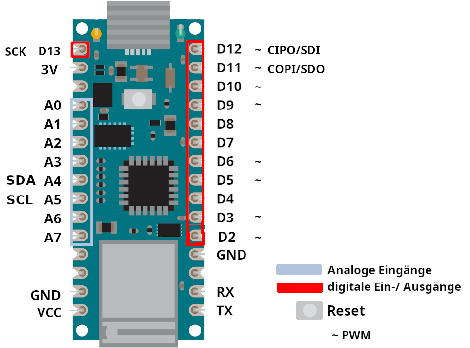 - Die digitalen Ein-/Ausgänge liefern im Normalfall ein HIGH (1) oder LOW (0). Eine Ausnahme bilden die mit einem ~ gekennzeichneten Pins. Sie können mit der ⇒Pulsweitenmodulation angesprochen werden.