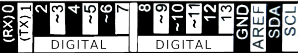 - Die digitalen Ein-/Ausgänge liefern im Normalfall ein HIGH (1) oder LOW (0). Eine Ausnahme bilden die mit einem ~ gekennzeichneten Pins. Sie können mit der ⇒Pulsweitenmodulation angesprochen werden.