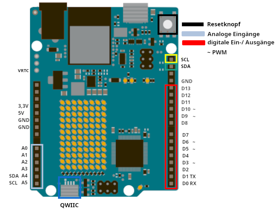 Quelle: 🔗https://docs.arduino.cc/hardware/uno-r4-wifi (eigene Bearbeitung abgerufen am 27.07.24)