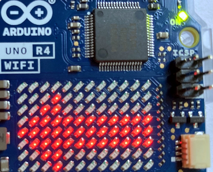 In der Arduino IDE findest du unter Beispiele -> LED_Matrix das Programm TextWithArduinoGraphics. Ich habe das Programm vereinfacht und kommentiert.