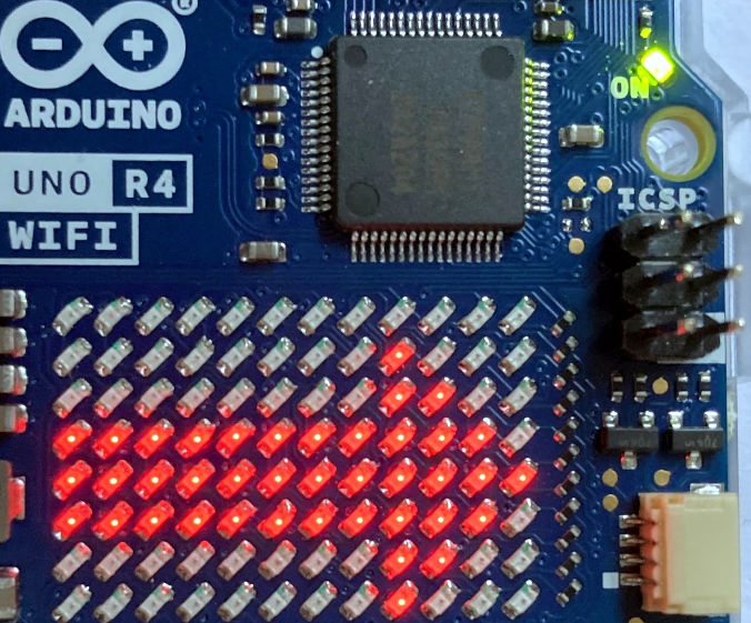 In der Arduino IDE findest du unter Beispiele -> LED_Matrix das Programm MatrixFrameBuffer. Ich habe das Programm als Vorlage genommen und vereinfacht. Das Programm erzeugt zufällige Pixelmuster.