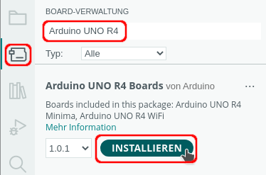 1 2 3 4 5 6 7 8 9 10 11 12 13 14 15 16 17 18 19 20 21 22 23 24 25 26 27 28 29 30 | #include “Arduino_LED_Matrix.h” ArduinoLEDMatrix Matrix; const unsigned long PfeilRechts[] = { 0x800, 0xcffeffff, 0xfe00c008, }; const unsigned long PfeilLinks[] = { 0x10030, 0x7fffff7, 0xff300100, }; void setup() { Matrix.begin(); Matrix.loadFrame(PfeilLinks); delay(1000); Matrix.loadFrame(PfeilRechts); } void loop() { // bleibt leer, Programm läuft nur einmal } |