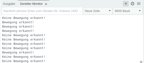 Befindet sich ein Objekt im „Sichtbereich“ des Bewegungsmelders, wird im Seriellen Monitor angezeigt, ob eine Bewegung erkannt wurde.