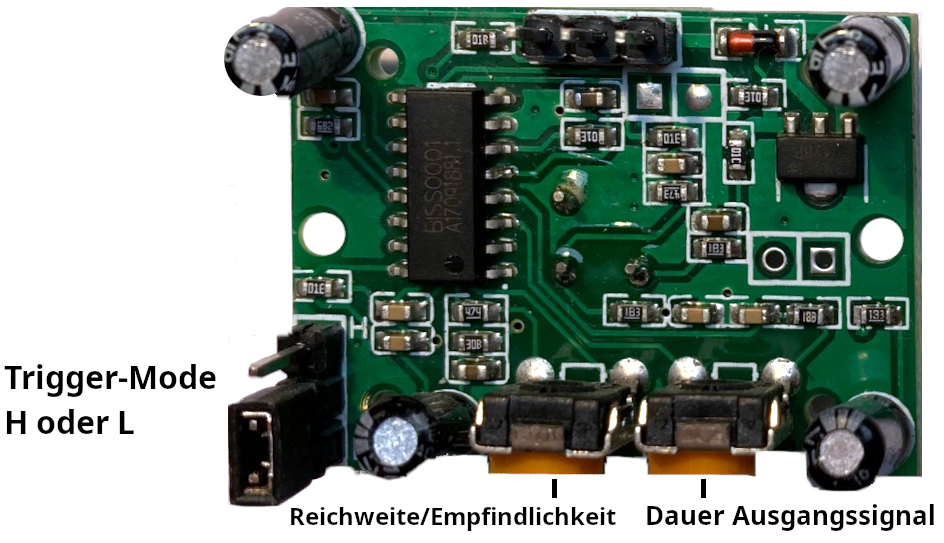 Der Bewegungsmelder HC-SR501 hat auf der Vorderseite zwei Potentiometer: Der linke stellt die Dauer des Ausgangssignal ein (Zeit, wie lange das Signal HIGH bleibt) , der rechte die Reichweite/Empfindlichkeit.