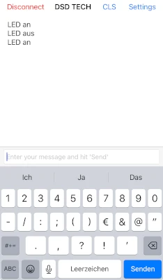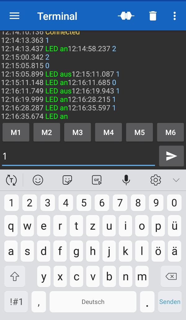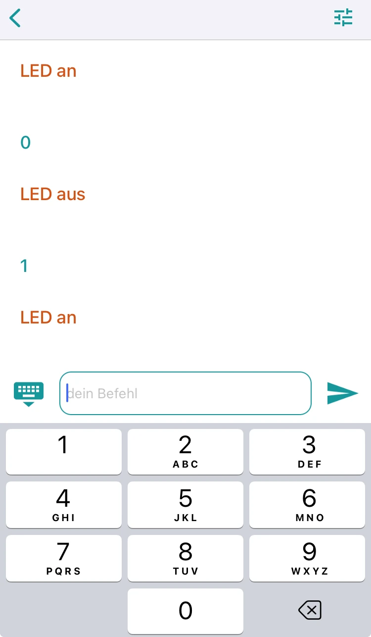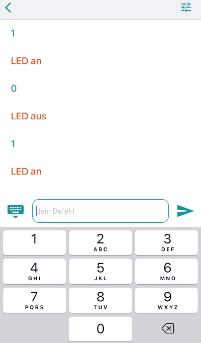 Die Taste 1 auf der Bild­schirm­tas­tatur der App schal­tet die LED an, 0 schal­tet sie wieder aus.