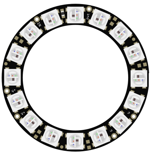 Der NeoPixel-Ring besteht aus mehreren miteinander verbundenen RGB-LEDs. Jede besitzt einen eigenen Controller und kann einzeln angesteuert werden. Er benötigt nur einen digitalen Eingang. Der NeoPixel-Ring ist in verschiedenen Bauformen zwischen 12 und 60 LEDs erhältlich.