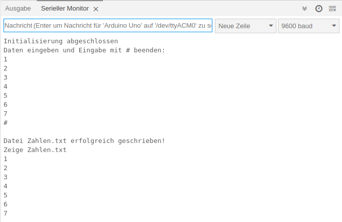 1 2 3 4 5 6 7 8 9 10 11 12 13 14 15 16 17 18 19 20 21 22 23 24 25 26 27 28 29 30 31 32 33 34 35 36 37 38 39 40 41 42 43 44 45 46 47 48 49 50 51 52 53 54 55 56 57 58 59 60 61 62 63 64 65 66 67 68 69 70 71 72 73 74 75 76 77 78 79 80 81 82 83 84 85 86 87 88 89 90 91 92 | #include “SdFat.h” SdFat SD; // Datenpin der SD-Karte int DatenPin = 10; bool Schreiben = false; void setup() { // Bezeichner für die Datei File Datei; Serial.begin(9600); // auf serielle Verbindung warten while (!Serial) { ; }; delay(500); /* SD-Karte mit Angabe des Datenpins starten wenn die Intialisierung fehlschlägt — keine SD-Karte vorhanden — falsche Pinbelegung -> es wird eine Fehlermeldung angezeigt */ if (!SD.begin(DatenPin)) { Serial.println(“Initialisierung fehlgeschlagen!”); } else Serial.println(“Initialisierung abgeschlossen”); // char-Array für den Dateinamen erstellen char Dateiname[20] = “Zahlen.txt”; String DatenSchreiben; /* O_CREAT -> Datei erstellen, wenn sie nicht existiert O_WRITE -> in die Datei schreiben O_AT_END -> Startposition zum Schreiben an das Ende der Datei setzen */ Datei.open(Dateiname, O_CREAT | O_WRITE | O_AT_END); // Daten in Datei schreiben Serial.println(“Daten eingeben und Eingabe mit # beenden:”); // solange kein # eingegeben wurde und Schreiben false ist while (DatenSchreiben != “#” && !Schreiben) { while (Serial.available() > 0) { DatenSchreiben = Serial.readStringUntil(‘\n’); Serial.println(DatenSchreiben); // wenn das erste eingegebene Zeichen # ist // -> Schreiben auf true setzen -> while verlassen if (DatenSchreiben.startsWith(“#”)) Schreiben = true; // ansonsten Datensatz in Datei schreiben else Datei.println(DatenSchreiben); } } // Datei schließen Datei.close(); Serial.println(“\nDatei ” + String(Dateiname) + ” erfolgreich geschrieben!”); // Datei Zahlen.txt öffnen Serial.println(“Zeige ” + String(Dateiname)); if (Datei.open(Dateiname, O_RDONLY)) { while (Datei.available()) { // … werden sie gelesen und im Seriellen Monitor ausgegeben Serial.write(Datei.read()); } } // wenn die Datei Zahlen.txt nicht existiert … else { // char-Array Dateiname muss in String umgewandelt werden Serial.print(“Datei ” + String(Dateiname) + ” nicht gefunden!”); } // Datei schließen Datei.close(); } void loop() { // bleibt leer, das Programm läuft nur einmal } |