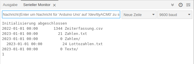1 2 3 4 5 6 7 8 9 10 11 12 13 14 15 16 17 18 19 20 21 22 23 24 25 26 27 28 29 30 31 32 33 34 35 | #include “SdFat.h” SdFat SD; // Datenpin der SD-Karte int DatenPin = 10; void setup() { Serial.begin(9600); // auf serielle Verbindung warten while (!Serial); delay(500); /* SD-Karte mit Angabe des Datenpins starten wenn die Intialisierung fehlschlägt — keine SD-Karte vorhanden — falsche Pinbelegung -> es wird eine Fehlermeldung angezeigt */ if (!SD.begin(DatenPin)) { Serial.println(“Initialisierung fehlgeschlagen!”); } else Serial.println(“Initialisierung abgeschlossen”); Serial.println(SD.ls(LS_DATE | LS_SIZE | LS_R)); } void loop() { // eleibt leer, das Programm läuft nur einmal } |