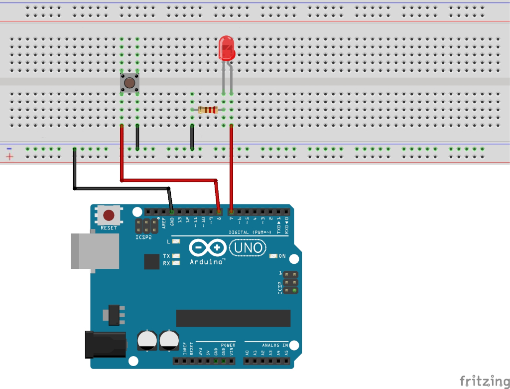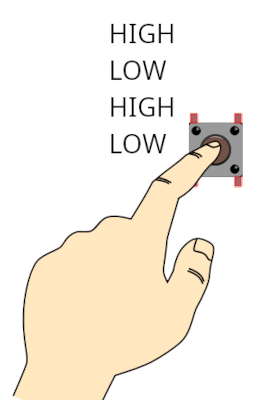 Lei­der ver­hin­dert das delay(200) nur sehr unzure­ichend das soge­nan­nte “Prellen” eines Tasters. Wird der Taster über eine län­gere Zeit gedrückt gehal­ten, wech­selt das aus­ge­sendete Sig­nal immer wieder zwis­chen HIGH und LOW. Dies führt zu uner­wün­scht­en Effek­te:. Im Beispiel­pogramm blinkt die LED solange der Taster gedrückt wird.