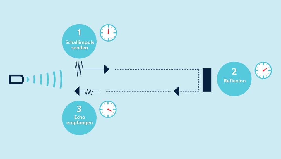 Trifft er auf ein Objekt, wird er dort reflektiert und gelangt als Echo zurück zum Ultraschallsensor. Aus der Zeitspanne zwischen dem Aussenden des Schallimpulses und dem Empfang des Echosignals berechnet der Ultraschallsensor intern die Entfernung zum Objekt.“
