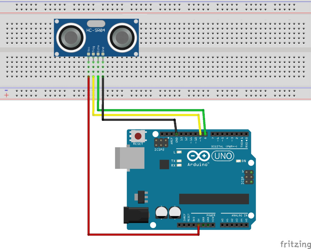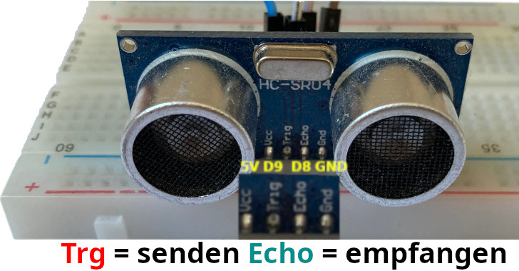 Im Programm sendet der Befehl pulseIn() ein HIGH-Signal, startet einen Timer und wartet anschließend darauf, dass das Signal wieder zurückkommt (den Wert LOW hat). Daraufhin wird der Timer gestoppt und die Zeitspanne zwischen dem Senden des Signal (Trigger) und seiner Rückkehr (Echo) wird in Mikrosekunden ermittelt.