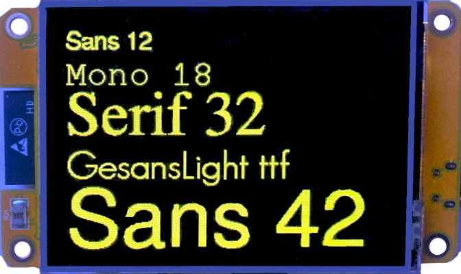 Es gibt Schriftarten in verschiedenen Größen, aber leider unterstützen sie nur den einfachen ASCII-Zeichensatz. Die Darstellung von Umlauten ist nicht möglich.