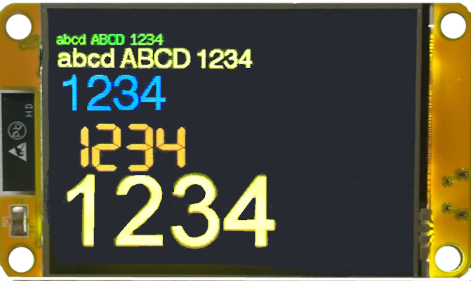 1 2 3 4 5 6 7 8 9 10 11 12 13 14 15 16 17 18 19 20 21 22 23 24 25 26 27 28 29 30 31 32 33 34 35 36 37 | #include “TFT_eSPI.h” TFT_eSPI tft = TFT_eSPI(); void setup() { tft.init(); tft.setRotation(1); tft.fillScreen(TFT_BLACK); tft.setTextColor(TFT_GREEN); tft.setCursor(0, 10); tft.setTextFont(2); tft.println(“abcd ABCD 1234”); tft.setTextColor(TFT_YELLOW); tft.setTextFont(4); tft.println(“abcd ABCD 1234”); tft.setTextColor(TFT_BLUE); tft.setTextFont(6); tft.println(1234); tft.setTextColor(TFT_BROWN); tft.setTextFont(7); tft.println(1234); tft.setTextColor(TFT_GOLD); tft.setTextFont(8); tft.println(1234); } void loop() { // bleibt leer, das Programm läuft nur einmal } |