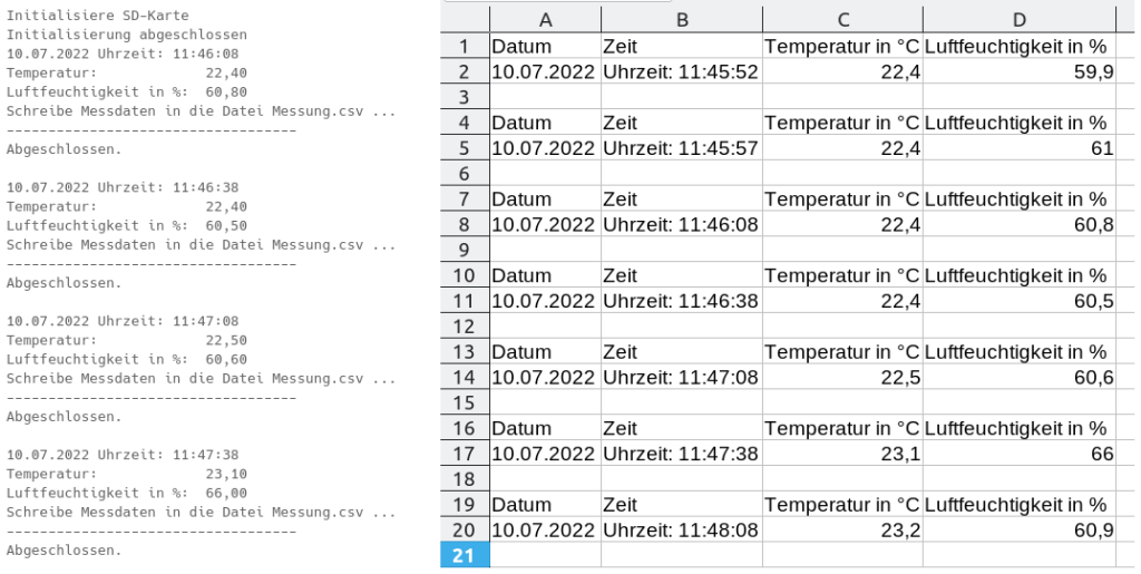 Das Pro­gramm soll die Wet­ter­dat­en im Seriellen Mon­i­tor anzeigen und gle­ichzeit­ig auf ein­er SD-Karte im CSV-For­mat aufze­ich­nen.