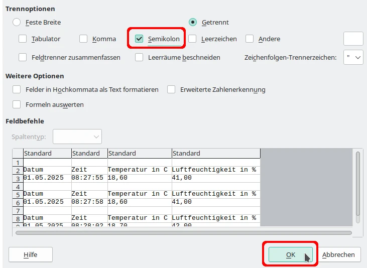 CSV-Dateien (Comma Seperated Value) trennen Datensätze nach bestimmten Zeichen. Das Komma kann nicht verwendet werden, weil es in der Anzeige von Temperatur und Luftfeuchtigkeit benutzt wird. Deshalb dient das Semikolon als Trennzeichen.
