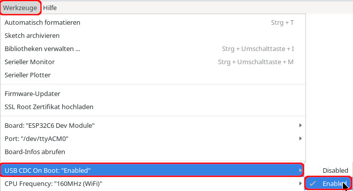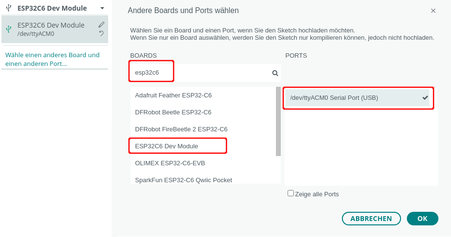 Wenn der ESP32-C6-Zero nicht automa­tisch erkan­nt wurde, klicke auf “Wäh­le ein anderes Board und einen anderen Port” und suche nach esp32c6. Je nach Betrieb­ssys­tem wird der USB-Port eine andere Beze­ich­nung haben.