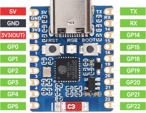 Der ESP32-C6-Zero ver­fügt über 13 dig­i­tale Pins, Blue­tooth und WiFi.