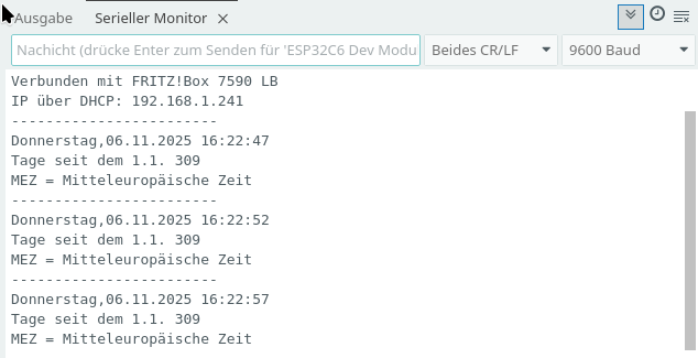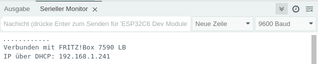 Im Seriellen Mon­i­tor wird die mit DHCP ermit­telte IP des ESP32-C6 angezeigt.