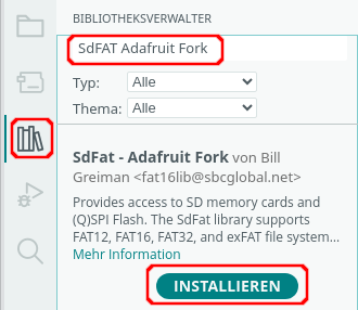 Wenn du zuvor die Bibliothek SdFat installiert hast, musst du sie über die Bibliotheksverwaltung deinstallieren und stattdessen den Adafruit Fork installieren.