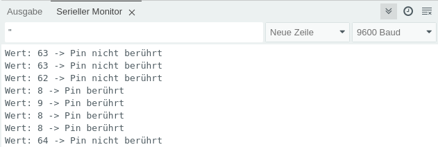 1 2 3 4 5 6 7 8 9 10 11 12 13 14 15 | void setup() { Serial.begin(9600); delay(1000); } void loop() { Serial.print(“Wert: ”); Serial.print(touchRead(32)); if (touchRead(32) < 20) Serial.println(“ -> Pin berührt”); else Serial.println(“ -> Pin nicht berührt”); delay(1000); } |