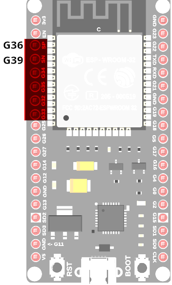 Es stehen drei ADC-Wandler (Analog Digital Converter) mit einer Auflösung von 9 Bit bis 12 Bit zur Verfügung. Wenn WiFi verwendet wird, können nur die Pins 32 bis 39 als analoge Eingänge angesprochen werden. Das Signal wird in Werte zwischen 0 und 4095 umgewandelt.