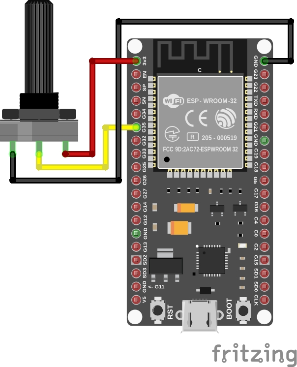 1 2 3 4 5 6 7 8 9 10 11 12 13 14 15 16 17 18 19 | // Potentiometer an Pin 35 int Potentiometer = 35; // Variable für den gelesenen Wert int GelesenerWert = 0; void setup() { Serial.begin(9600); delay(1000); } void loop() { // analogen Wert lesen GelesenerWert = analogRead(Potentiometer); Serial.println(GelesenerWert); delay(500); } |