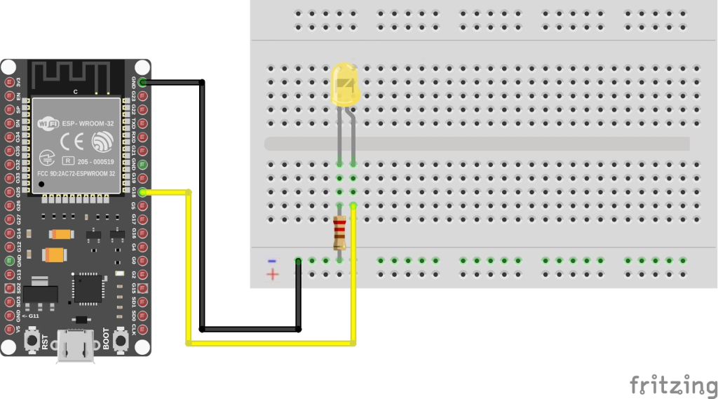 1 2 3 4 5 6 7 8 9 10 11 12 13 14 | int LED = 18; void setup() { pinMode(LED, OUTPUT); } void loop() { digitalWrite(LED, HIGH); delay(1000); digitalWrite(LED, LOW); delay(1000); } |