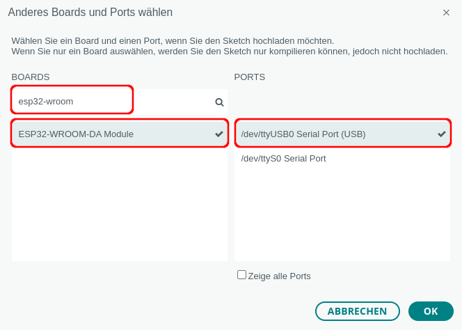 Wenn der ESP32-WROOM nicht automatisch erkannt wurde, klicke auf “Wähle ein anderes Board und einen anderen Port” und suche nach esp32-wroom. Je nach Betriebssystem wird der USB-Port eine andere Bezeichnung haben.