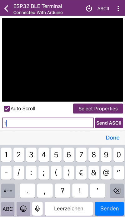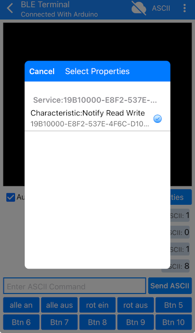 1 2 3 4 5 6 7 8 9 10 11 12 13 14 15 16 17 18 19 20 21 22 23 24 25 26 27 28 29 30 31 32 33 34 35 36 37 38 39 40 41 42 43 44 45 46 47 48 49 50 51 52 53 54 55 56 57 58 59 60 61 62 63 64 65 66 67 68 69 70 71 72 73 74 75 76 77 78 79 80 81 82 83 84 85 | #include “ArduinoBLE.h” /* eindeutige UUID bestimmen: https://www.guidgenerator.com/online-guid-generator.aspx https://www.uuidgenerator.net/ BLERead | BLEWrite | BLENotify -> schreiben, lesen, Info */ // Name BLE-Service BLEService LEDSchalten(“19b10000-e8f2-537e-4f6c-d104768a1214”); BLEUnsignedCharCharacteristic Auswahl(“19b10000-e8f2-537e-4f6c-d104768a1214”, BLERead | BLEWrite | BLENotify); // LED an Pin 18 int LED = 18; void setup() { Serial.begin(9600); // auf serielle Verbindung warten while (!Serial); delay(1000); // pinMode festlegen pinMode(LED, OUTPUT); // BLE starten if (!BLE.begin()) Serial.println(“Bluetooth-Modul konnte nicht gestartet werden!”); else Serial.println(“Bluetooth-Modul erfolgreich gestartet!”); // Name festlegen (wird in der App angezeigt) und den Service (LEDSchalten) zuweisen BLE.setLocalName(“LED schalten”); BLE.setAdvertisedService(LEDSchalten); // Auswahl als Platzhalter für den in der App gewählten Wert LEDSchalten.addCharacteristic(Auswahl); // Service LEDSchalten hinzufügen BLE.addService(LEDSchalten); // Startwert für die Kommunikation schreiben Auswahl.writeValue(0); // Zuweisung starten BLE.advertise(); } void loop() { // auf die Verbindung zu Geräten warten BLEDevice Verbindung = BLE.central(); // wenn der ESP32 mit einem Gerät verbunden ist … if (Verbindung) { Serial.println(“Verbunden … ”); // solange der Controller mit einem Gerät verbunden ist … while (Verbindung.connected()) { if (Auswahl.written()) { // LED einschalten if (Auswahl.value() == ‘1’) { Serial.print(char(Auswahl.value())); Serial.println(“ -> LED ein”); digitalWrite(LED, HIGH); } // LED ausschalten if (Auswahl.value() == ‘0’) { Serial.print(char(Auswahl.value())); Serial.println(F(“ -> LED aus”)); digitalWrite(LED, LOW); } } } } } |