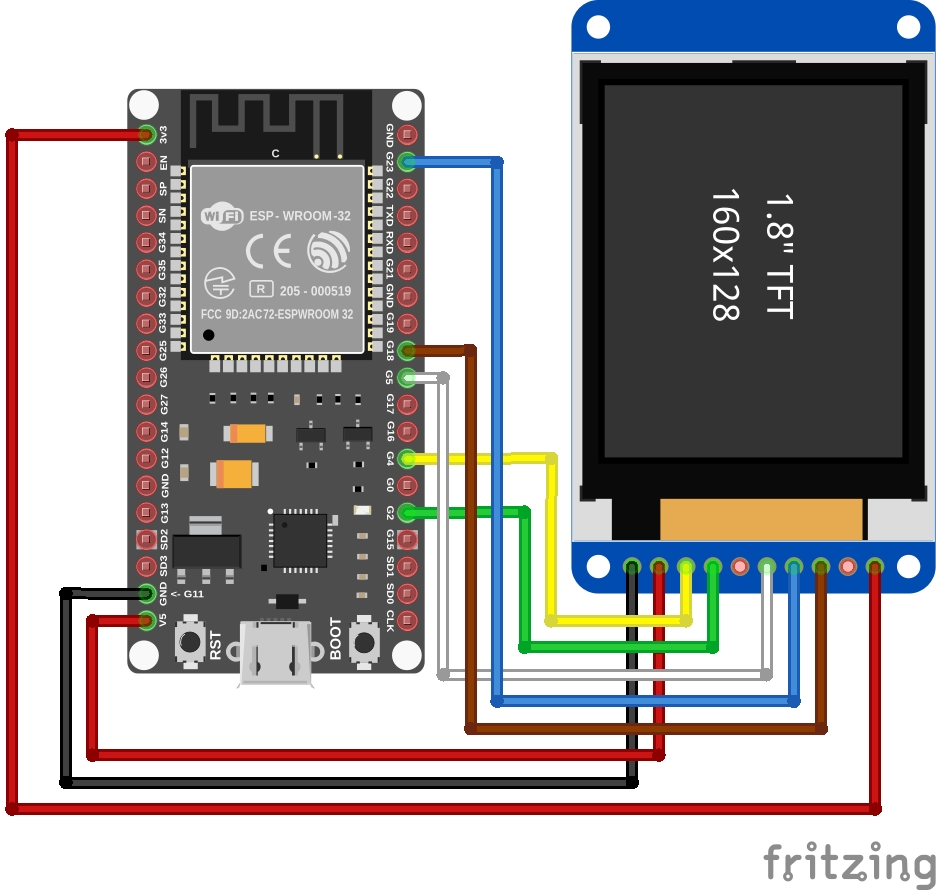 1 2 3 4 5 6 7 8 9 10 11 12 13 14 15 16 17 18 19 20 21 22 23 24 25 26 27 28 29 30 31 32 33 34 35 36 37 38 39 40 41 42 43 44 45 46 47 48 49 50 51 52 53 54 55 56 57 58 59 60 61 62 63 64 65 66 67 68 69 70 71 72 73 74 75 76 77 78 79 80 81 82 83 84 85 86 87 88 89 90 | // Bibliotheken einbinden #include “Adafruit_GFX.h” #include “Adafruit_ST7735.h” /* SPI-Pins 23 -> COPI/SDO 19 -> CIPO/SDI (nicht verwendet) 18 -> CLK 5 -> CS */ #define TFT_CS 5 #define TFT_RST 22 #define TFT_DC 2 Adafruit_ST7735 tft = Adafruit_ST7735(TFT_CS, TFT_DC, TFT_RST); void setup() { Serial.begin(9600); delay(500); Serial.println(“Bildschirm: ” + String(tft.height()) + ” x ” + String(tft.width())); tft.initR(INITR_BLACKTAB); // Rotation anpassen tft.setRotation(2); // schwarzer Hintergrund tft.fillScreen(ST7735_BLACK); // verschiedene Schriftgrößen tft.setTextSize(1); tft.setCursor(1, 5); tft.setTextColor(ST7735_BLUE); tft.print(“Text”); delay(500); tft.setTextSize(2); tft.setCursor(1, 20); tft.setTextColor(ST7735_GREEN); tft.print(“Text”); delay(500); tft.setTextSize(3); tft.setCursor(1, 40); tft.setTextColor(ST7735_RED); tft.print(“Text”); delay(500); tft.setTextSize(4); tft.setCursor(1, 70); tft.setTextColor(ST7735_YELLOW); tft.print(“Text”); delay(2000); // Linien ziehen tft.fillScreen(ST7735_BLACK); for (int i = 1; i < tft.height(); i+=10) { tft.drawLine(1, i, tft.width(), i, ST7735_ORANGE); } delay(2000); // Kreise zeichnen tft.fillScreen(ST7735_BLACK); tft.fillCircle(tft.width() / 2, tft.height() / 2, 50, ST7735_MAGENTA); tft.fillCircle(tft.width() / 2, tft.height() / 2, 30, ST7735_GREEN); tft.fillCircle(tft.width() / 2, tft.height() / 2, 10, ST7735_YELLOW); delay(2000); // Rechtecke zeichnen tft.fillScreen(ST7735_BLACK); tft.drawRect(1, 1, 50, 50, ST7735_ORANGE); tft.drawRect(5, 5, 50, 50, ST7735_ORANGE); tft.drawRect(10, 10, 50, 50, ST7735_ORANGE); delay(2000); // ausgefüllte Rechtecke zeichnen tft.fillScreen(ST7735_BLACK); tft.fillRect(5, 5, 50, 50, ST7735_GREEN); tft.fillRect(10, 10, 70, 70, ST7735_BLUE); tft.fillRect(15, 15, 90, 90, ST7735_RED); } void loop() { // nichts zu tun, das Programm // läuft nur einmal } |