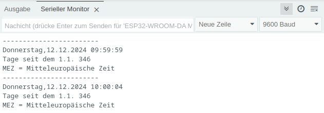 1 2 3 4 5 6 7 8 9 10 11 12 13 14 15 16 17 18 19 20 21 22 23 24 25 26 27 28 29 30 31 32 33 34 35 36 37 38 39 40 41 42 43 44 45 46 47 48 49 50 51 52 53 54 55 56 57 58 59 60 61 62 63 64 65 66 67 68 69 70 71 72 73 74 75 76 77 78 79 80 81 82 83 84 85 86 87 88 89 90 91 92 93 94 95 96 97 98 99 100 101 102 103 104 105 106 107 108 109 110 111 112 113 114 115 116 117 118 119 120 121 122 123 124 125 126 127 128 129 130 131 132 133 134 135 136 137 138 139 140 141 142 | #include “WiFi.h” #include “time.h” char Router[] = “Router_SSID”; char Passwort[] = “xxxxxxxx”; // NTP-Server aus dem Pool #define Zeitserver “de.pool.ntp.org” /* Liste der Zeitzonen https://github.com/nayarsystems/posix_tz_db/blob/master/zones.csv Zeitzone CET = Central European Time ‑1 -> 1 Stunde zurück CEST = Central European Summer Time von M3 = März, 5.0 = Sonntag 5. Woche, 02 = 2 Uhr bis M10 = Oktober, 5.0 = Sonntag 5. Woche 03 = 3 Uhr */ #define Zeitzone “CET-1CEST,M3.5.0/02,M10.5.0/03” // time_t enthält die Anzahl der Sekunden seit dem 1.1.1970 0 Uhr time_t aktuelleZeit; /* Struktur tm tm_hour -> Stunde: 0 bis 23 tm_min -> Minuten: 0 bis 59 tm_sec -> Sekunden 0 bis 59 tm_mday -> Tag 1 bis 31 tm_wday -> Wochentag (0 = Sonntag, 6 = Samstag) tm_mon -> Monat: 0 (Januar) bis 11 (Dezember) tm_year -> Jahre seit 1900 tm_yday -> vergangene Tage seit 1. Januar des Jahres tm_isdst -> Wert > 0 = Sommerzeit (dst = daylight saving time) */ tm Zeit; WiFiServer Server(80); WiFiClient Client; void setup() { // Zeitzone: Parameter für die zu ermittelnde Zeit configTzTime(Zeitzone, Zeitserver); Serial.begin(9600); // auf serielle Verbindung warten while (!Serial); delay(1000); // WiFi starten WiFi.mode(WIFI_STA); WiFi.begin(Router, Passwort); Serial.println(“————————”); while (WiFi.status() != WL_CONNECTED) { delay(200); Serial.print(“.”); } Serial.println(); Serial.print(“Verbunden mit ”); Serial.println(Router); Serial.print(“IP über DHCP: ”); Serial.println(WiFi.localIP()); } void loop() { // aktuelle Zeit holen time(&aktuelleZeit); // localtime_r -> Zeit in die lokale Zeitzone setzen localtime_r(&aktuelleZeit, &Zeit); Serial.println(“————————”); // es kann bis zu 30 Sekunden dauern // bis die Zeit ermittelt wird // Name des Wochentages 0–6 switch (Zeit.tm_wday) { case 0: Serial.print(“Sonntag”); break; case 1: Serial.print(“Montag”); break; case 2: Serial.print(“Dienstag”); break; case 3: Serial.print(“Mittwoch”); break; case 4: Serial.print(“Donnerstag”); break; case 5: Serial.print(“Freitag”); break; case 6: Serial.print(“Samstag”); break; } Serial.print(“,”); if (Zeit.tm_mday < 10) Serial.print(“0”); Serial.print(Zeit.tm_mday); Serial.print(“.”); // Monat: führende 0 ergänzen // Zählung beginnt mit 0 -> +1 if ((Zeit.tm_mon + 1) < 10) Serial.print(“0”); Serial.print(Zeit.tm_mon + 1); Serial.print(“.”); // Anzahl Jahre seit 1900 Serial.print(Zeit.tm_year + 1900); Serial.print(“ ”); // Stunde: wenn Stunde < 10 -> 0 davor setzen if (Zeit.tm_hour < 10) Serial.print(“0”); Serial.print(Zeit.tm_hour); Serial.print(“:”); // Minuten if (Zeit.tm_min < 10) Serial.print(“0”); Serial.print(Zeit.tm_min); Serial.print(“:”); // Sekunden if (Zeit.tm_sec < 10) Serial.print(“0”); Serial.print(Zeit.tm_sec); Serial.println(); Serial.println(“Tage seit dem 1.1. ” + String(Zeit.tm_yday)); // Normalzeit/Sommerzeit if(Zeit.tm_isdst > 0) Serial.println(“MESZ = Mitteleuropäische Sommerzeit”); else Serial.println(“MEZ = Mitteleuropäische Zeit”); delay(5000); } |