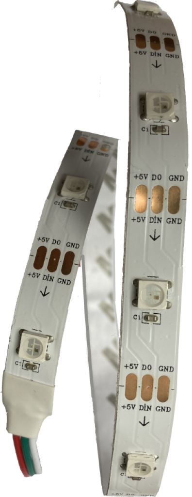 Der LED-Streifen besteht aus mehreren miteinander verbundenen RGB-LEDs. Jede besitzt einen eigenen Controller und kann einzeln angesteuert werden. Er benötigt nur einen digitalen Eingang.