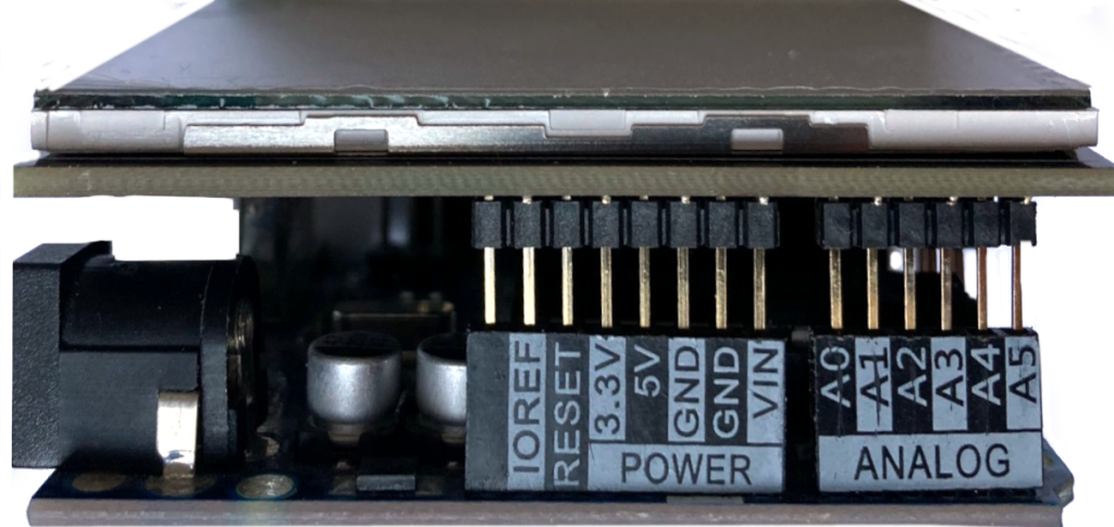 Es wird ein soge­nan­ntes Shield ver­wen­det, es wird ein­fach auf den Arduino UNO R3/UNO R4 aufgesteckt. Das darauf mon­tierte TFT ver­fügt über 320x240 Pix­el.