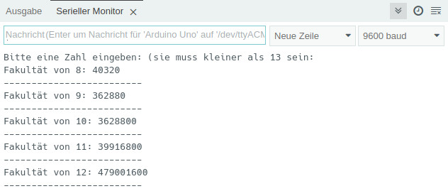 1 2 3 4 5 6 7 8 9 10 11 12 13 14 15 16 17 18 19 20 21 22 23 24 25 26 27 28 29 30 31 32 33 34 35 36 37 38 39 40 41 42 43 | void setup() { Serial.begin(9600); // auf serielle Verbindung warten while (!Serial); } void loop() { // auf serielle Eingabe warten while (Serial.available() > 0) { int Zahl = Serial.parseInt(); // Enter/Senden gedrückt if (Serial.read() == ‘\n’) { /* die Variable unsigned long ist auf den Wert 4.294.967.295 beschränkt 13! = 6.227.020.800 -> größere Werte nicht möglich */ if (Zahl < 13) { unsigned long Fakultaet = FakultaetBerechnen(Zahl); Serial.println(“Fakult\u00e4t von ” + String(Zahl) + “: ” + Fakultaet); Serial.println(“————————-”); } else Serial.println(“Die Zahl muss < 13 sein!”); } } } long FakultaetBerechnen(long Zahl) { unsigned long Ergebnis = 1; for (int i = 1; i <= Zahl; i++) { Ergebnis = Ergebnis * i; } return Ergebnis; } |