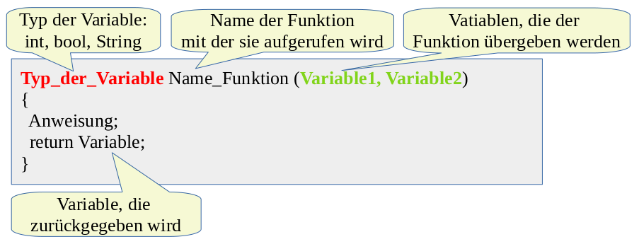 Die Funktion mit einem Rückgabewert besteht aus der Deklaration des Typs der Variablen (int, float, bool, String), die zurückgegeben wird, optional einer oder mehrere durch Kommata getrennte Variablen, die der Funktion übergeben werden und den Anweisungen.