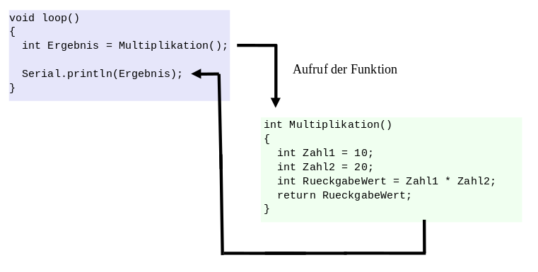 Mit Funktionen können Programmteile erstellt werden, die eine bestimmte Aufgabe ausführen und dann zu der Stelle im Programm zurückkehren, von dem aus die Funktion aufgerufen wurde. Der Vorteil ist, dass häufig verwendete Programmteile nur einmal erstellt werden müssen. Sie können dann an beliebiger Stelle im Programm aufgerufen werden. Eine Funktion kann eine Folge von Befehlen ausführen und eine Variable an die Stelle zurückgeben (return), von der sie aufgerufen wurde oder lediglich eine Folge von Befehlen “abarbeiten”.