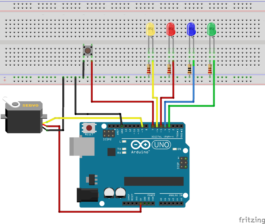 1 2 3 4 5 6 7 8 9 10 11 12 13 14 15 16 17 18 19 20 21 22 23 24 25 26 27 28 29 30 31 32 33 34 35 36 37 38 39 40 41 42 43 44 45 46 47 48 49 50 51 52 53 54 55 56 57 58 59 60 61 62 63 64 65 66 67 | #include “Servo.h” // Bezeichnung des Motors Servo Motor; int Position; int TASTER = 7; int TasterLesen; int gelbeLED = 6; int roteLED = 5; int blaueLED = 4; int grueneLED = 3; void setup() { pinMode(TASTER, INPUT_PULLUP); for (int i = 3;i < 7; i++) { pinMode(i, OUTPUT); } // Pin 9 dem Motor zuordnen Motor.attach(9); // Zufallsgenerator starten randomSeed(A0); // Motor nach links fahren Motor.write(0); } void loop() { TasterLesen = digitalRead(TASTER); if (TasterLesen == LOW) { delay(500); for (int i = 3;i < 7; i++) { digitalWrite(i, LOW); } int Minimum = 5; int Maximum = 175; int Position = random(Minimum, Maximum); Motor.write(Position); delay(500); switch (Position) { case 0 ... 45: digitalWrite(gelbeLED, HIGH); break; case 46 ... 90: digitalWrite(roteLED, HIGH); break; case 91 ... 135: digitalWrite(blaueLED, HIGH); break; case 136 ... 180: digitalWrite(grueneLED, HIGH); break; } } } |