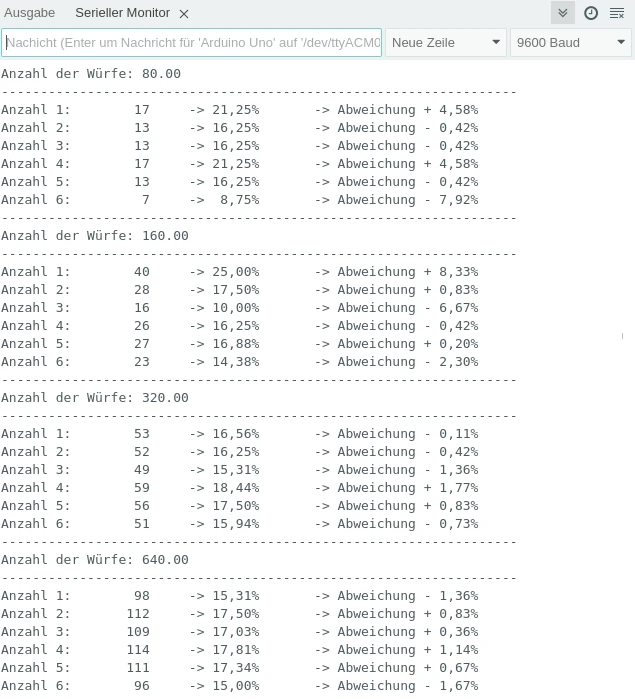 1 2 3 4 5 6 7 8 9 10 11 12 | void setup() { Serial.begin(9600); // auf serielle Verbindung warten while (!Serial) {;} Serial.println(“Laplace-Versuch -> s = Start”); Serial.println(“—————————————–”); Serial.println(“Die Anzahl der W\u00fcrfe wird jeweils verdoppelt!”); Serial.println(“—————————————–”); } |