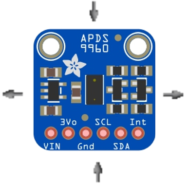 Der APDS-9960 analysiert mit Hilfe einer Infrarot-LED Bewegungen in seinem Sichtbereich. Dabei kann er vier Richtungen (links, rechts, nach oben, nach unten) unterscheiden, die Handbewegungen vom Sensor weg und zum Sensor hin erkennen und die Farben Rot, Grün und Blau „sehen“.