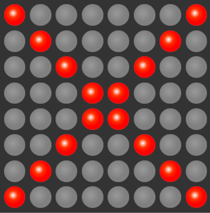 void Kreuz() { byte Zeichen[8] = { 0b10000001, // 1. Reihe 0b01000010, // 2. Reihe 0b00100100, // 3. Reihe 0b00011000, // 4. Reihe 0b00011000, // 5. Reihe 0b00100100, // 6. Reihe 0b01000010, // 7. Reihe 0b10000001 // 8. Reihe }; // Matrix anzeigen for (int i = 0; i < 8; i++) { LEDMatrix.setRow(0, i, Zeichen[i]); } } |