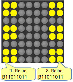 Die Schreib­weise für jede Rei­he kann binär angegeben wer­den: 0 = aus, 1 = an. Den Werten wird ein “B” vor­angestellt.