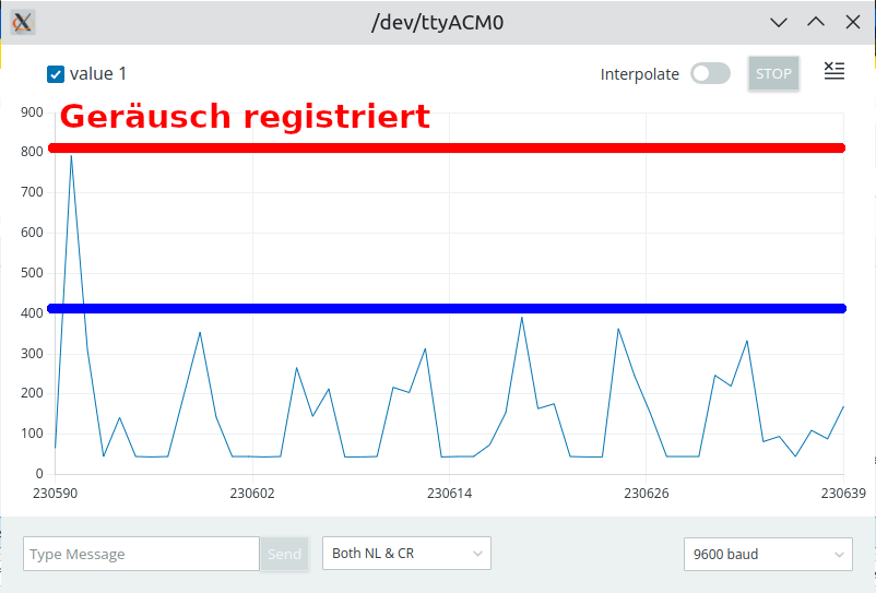 Mit Hilfe des ⇒ Seriellen Plotters kannst du herausfinden, wann der Soundsensor auf ein Geräusch reagieren soll.