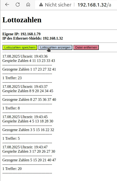 In einem Webformular können Lottozahlen ermittelt, angezeigt und gespeichert werden. Der Arduino „spielt“ für dich 6 Zahlen. Anschließend werden die Lottozahlen gezogen, aufsteigend sortiert und auf die Anzahl der übereinstimmenden Zahlen untersucht.