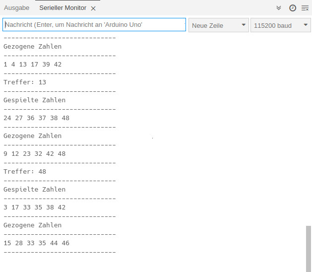 Der Arduino „spielt“ für dich 6 Zahlen. Anschließend werden die Lottozahlen gezogen, aufsteigend sortiert und auf die Anzahl der übereinstimmenden Zahlen untersucht. Das Ergebnis wird im Seriellen Monitor angezeigt.