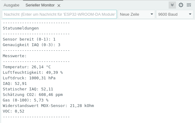 | gasResistance() | Widerstandswert in kOhm des MOX-Sensors | Je niedriger der Wert, desto höher ist die Konzentration der VOCs |